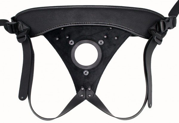 Трусики с широким кольцом и специальным дополнительным фиксатором. Вся система регулируемая. Металлические кнопки позволяют надежно фиксировать огромные фаллосы